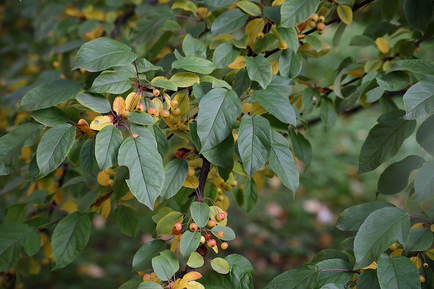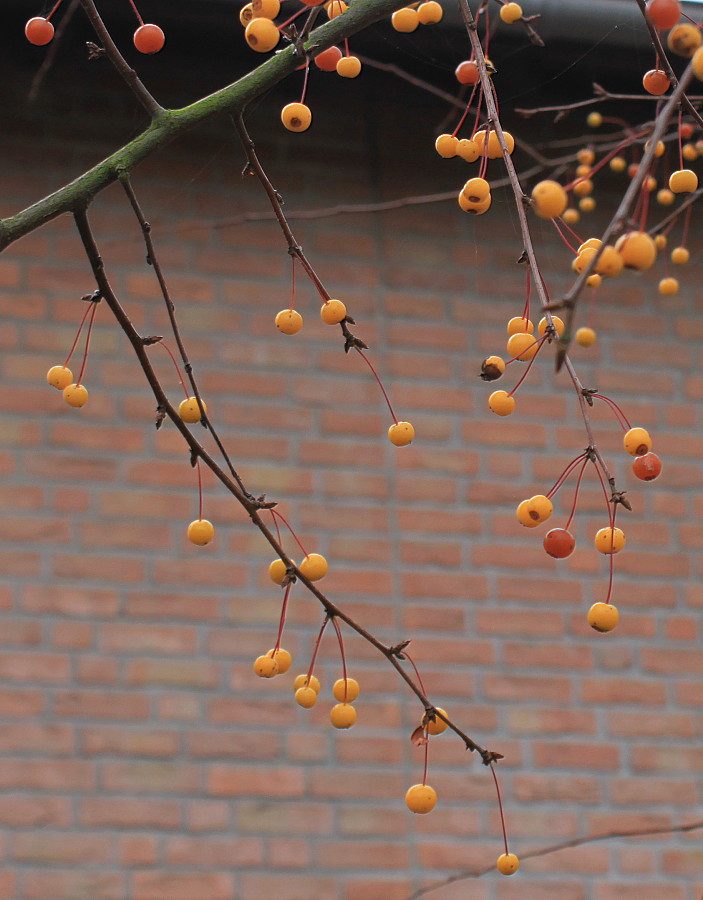 Очень густая крона, правильной овальной формы. Листья мелкие, но их много - крона густая. Ранозацветающий вид с красивой кроной, с крупными глянцевыми листьями. Бутоны карминно-розовые, цветки белые. Плоды мелкие, шаровидные, не более 10 мм в диаметре, красные или желтые. Благодаря компактной форме кроны может использоваться на небольших участках. Отлично смотрится в рядовых аллейных посадках. В качестве декоративного растения давно используется в Восточной Азии и Европе. В нашей климатической зоне устойчива к парше. Обладает хорошей способностью к восстановлению.