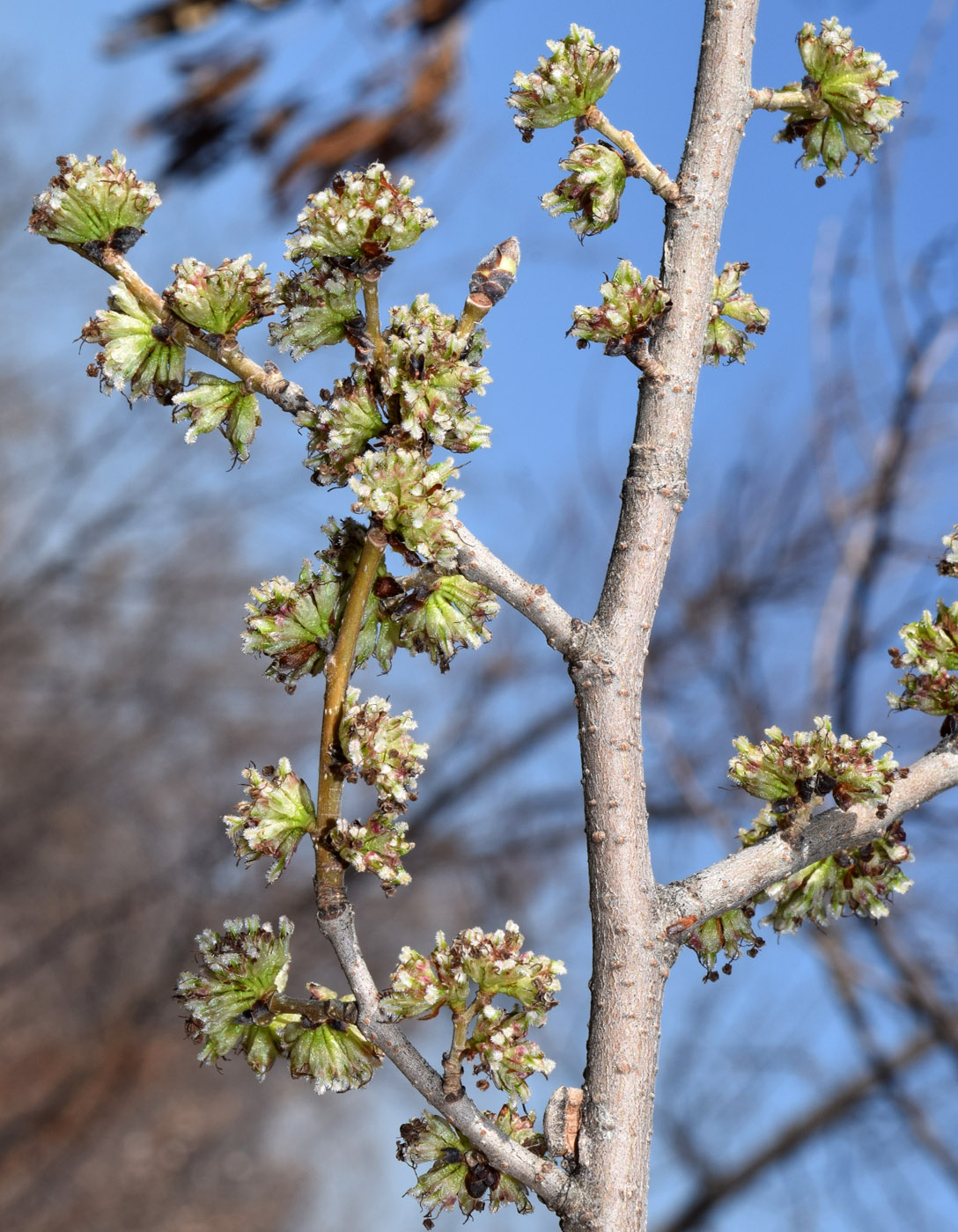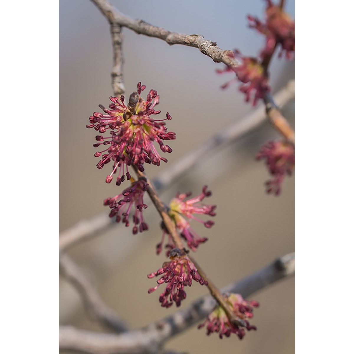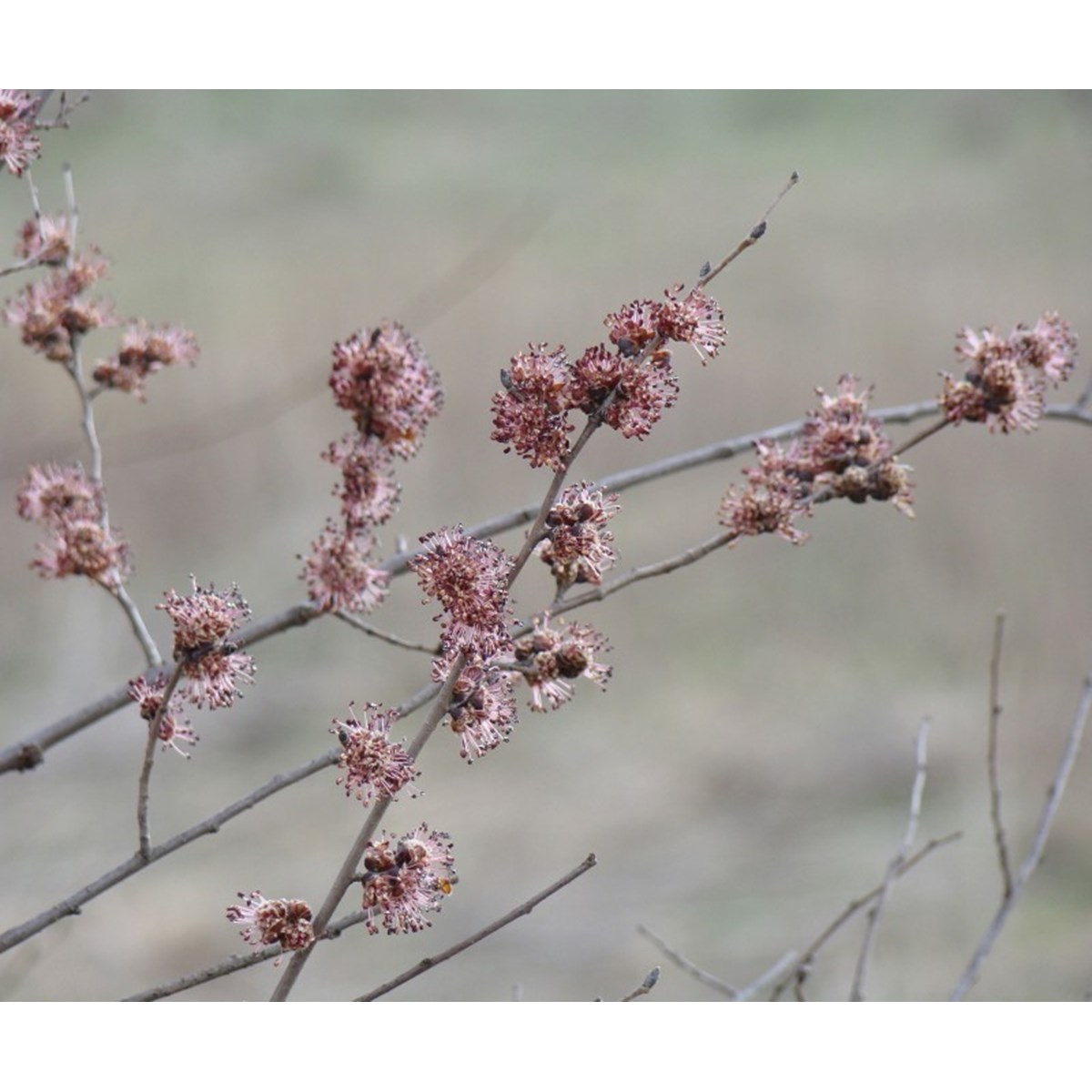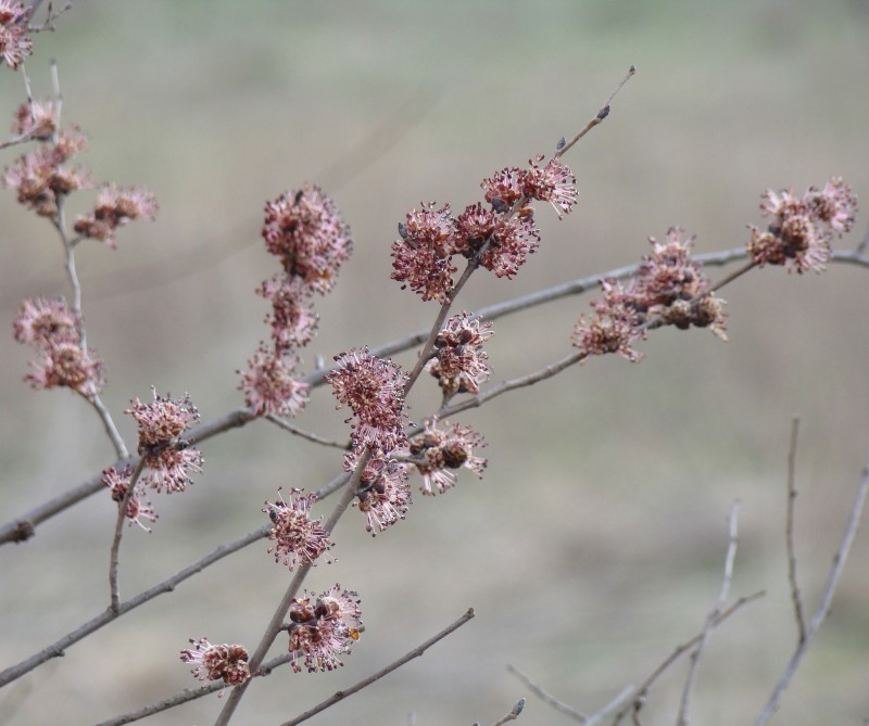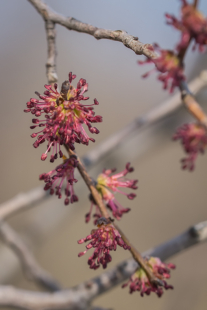 | Цветение | Цветки мелкие, фиолетово-красноватые, появляются до распускания листьев. |